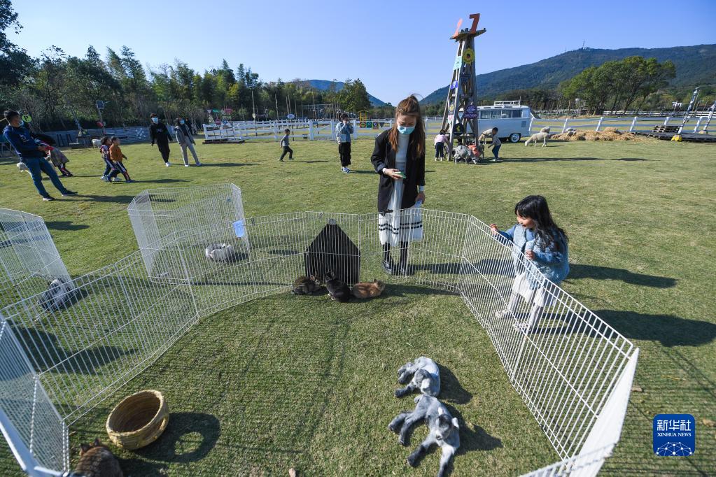 11月10日,游客在菰城村的Go Farm趣农场与动物互动。