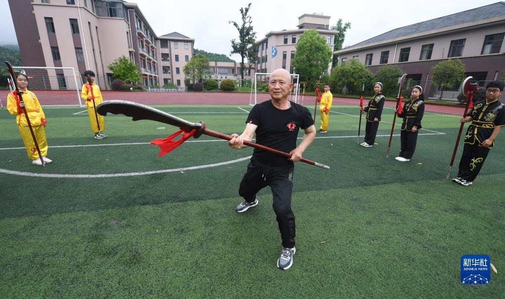 4月26日,临安武术协会理事程金跃在指导板桥小学学生们练习传统的“十八般武艺”。“十八般武艺”是流行于浙江省杭州市余杭区的传统体育运动,由十八般古兵器操练法演变而来,作为浙江省级非遗项目列入该校“第二课堂”特色课程。