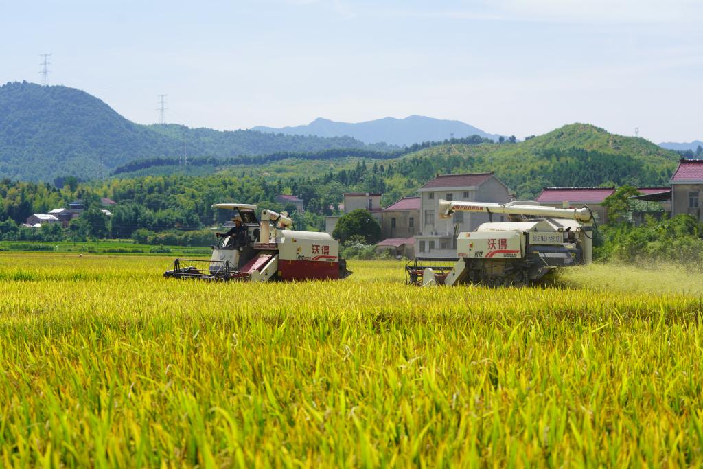7月中旬,收割机在潘发友的300亩早稻田里作业。新华社发(杨亮 摄)