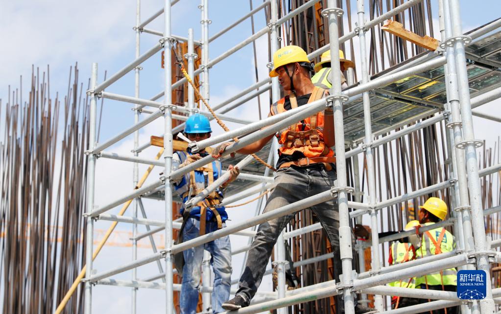 8月29日,工人在临港西岛金融中心项目工地上,安装用于塔楼剪力墙钢筋绑扎的脚手架。