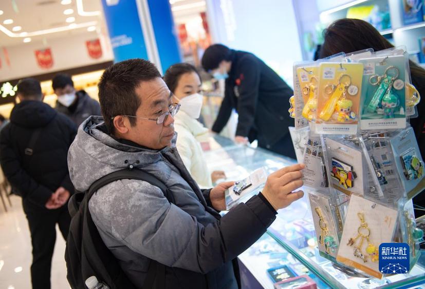 日前,杭州亚运会特许商品零售店入驻北京王府井工美大厦,吸引市民前来购买商品。