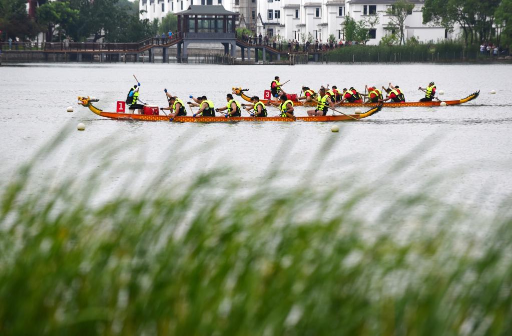 2022年6月3日,人们在江苏省无锡市锡山区鹅湖镇南青荡水域参加龙舟赛。新华社发(还月亮摄)