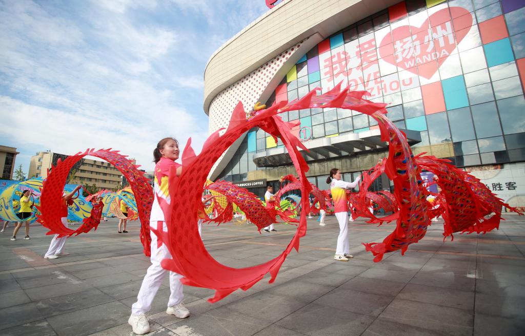 2022年8月6日,“彩带龙”爱好者在扬州市邗江区一处市民广场表演。新华社发(孟德龙摄)