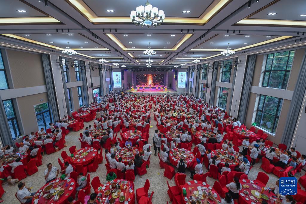 5月27日,梅坪村的村民在新建成的文化中心内的村文化礼堂,参加百家宴并观看文艺演出。
