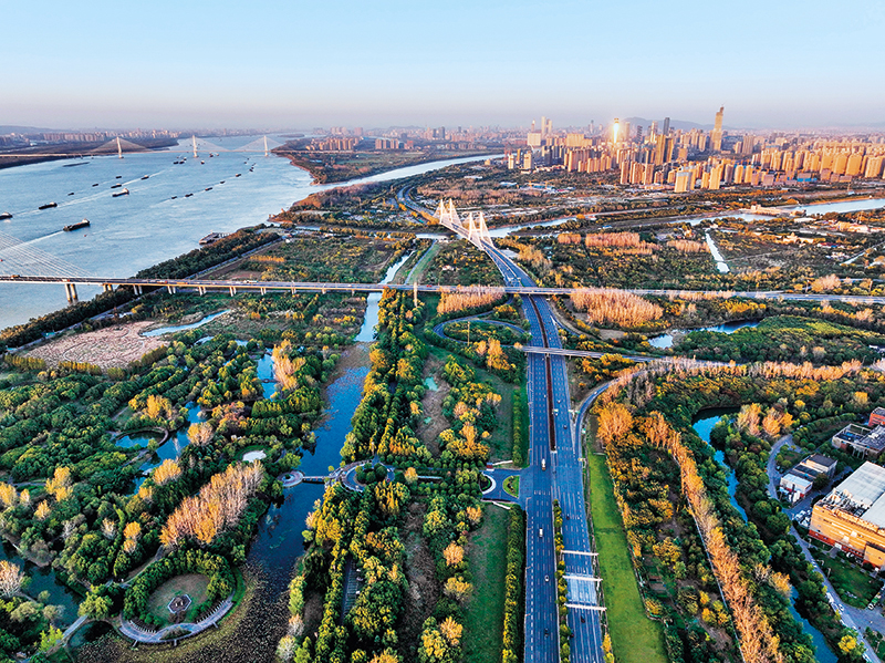 长江江畔的三桥湿地公园、南京城市景色(2023年11月6日摄) 季春鹏 摄