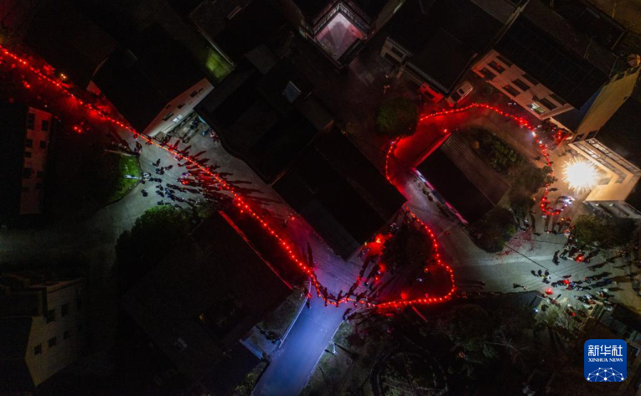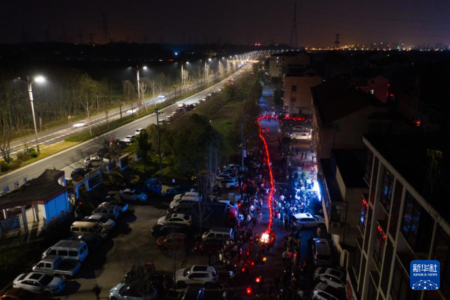 2月19日,在澧浦镇里新村,村民们抬着长长的传统板凳龙在村落中穿行(无人机照片)。
