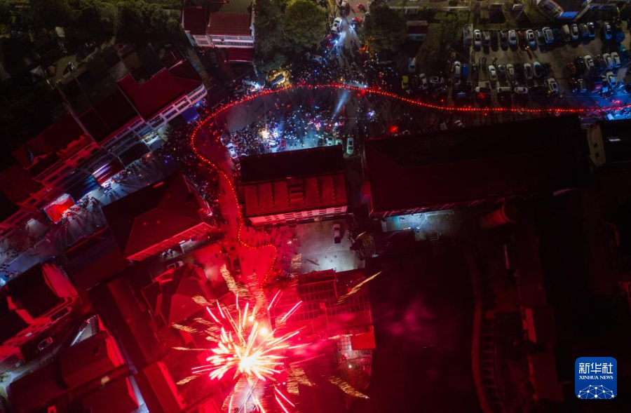 2月19日,在澧浦镇下宅村,村民们抬着100多节长的传统板凳龙在村落中穿行,与燃放的焰火组成了美丽的年俗画面(无人机照片)。