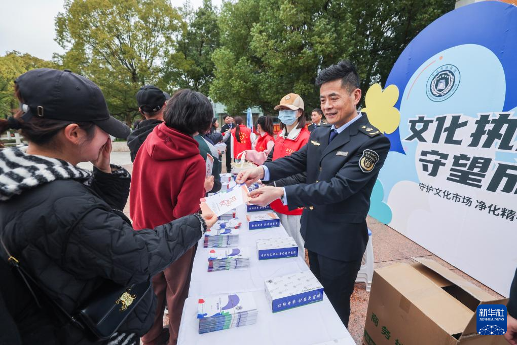 3月18日,诸暨市文化市场行政执法队工作人员在城市广场发放文化市场相关法治知识宣传册。
