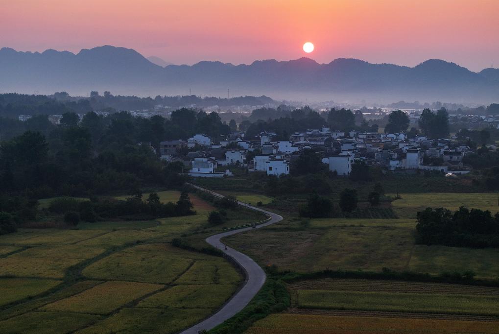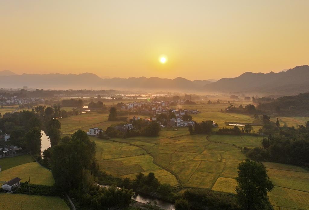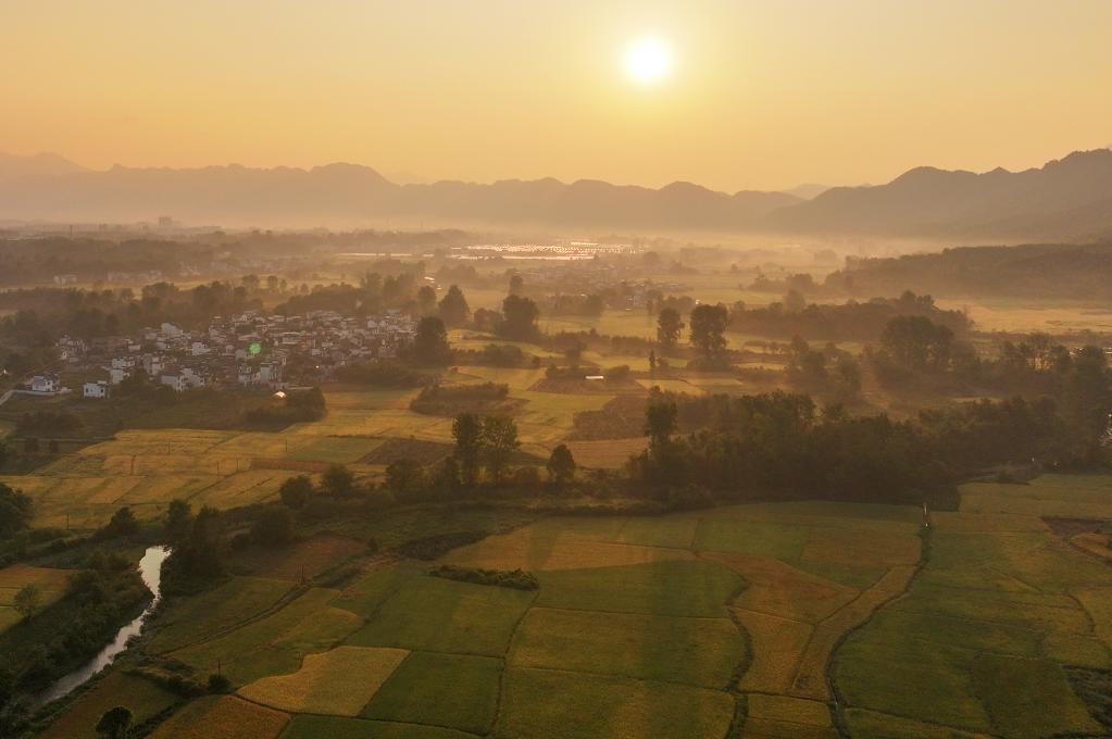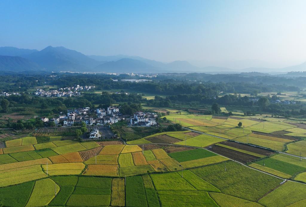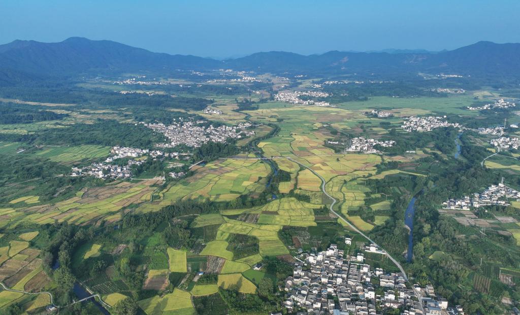近日,在安徽省黄山市黟县碧阳镇南屏村,金色的稻田、错落有致的村庄与蜿蜒的乡村道路相映成景,勾勒出一幅美丽的秋日田园丰收画卷。