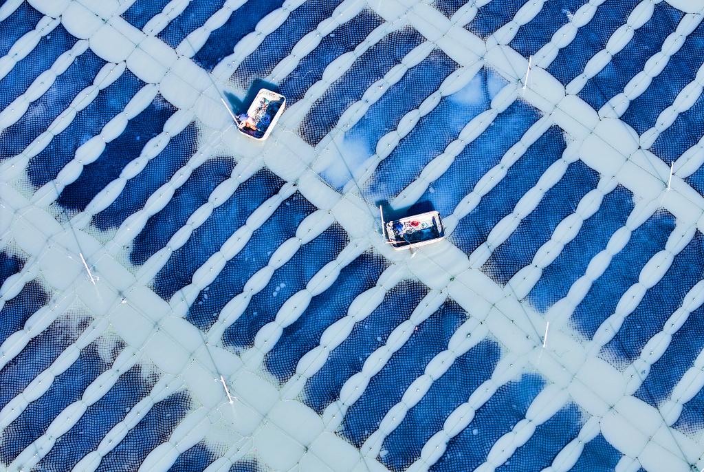 12月22日,渔民在江苏省连云港市海州湾渔场养殖区收获紫菜(无人机照片)。