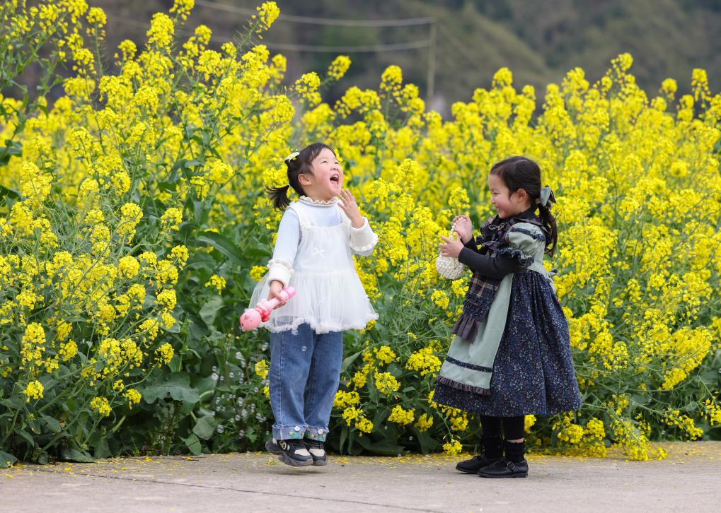 ↑2025年3月16日,贵州省铜仁市玉屏侗族自治县平溪街道舞阳社区,小朋友们在油菜花田间游玩。CICPHOTO/胡攀学 摄