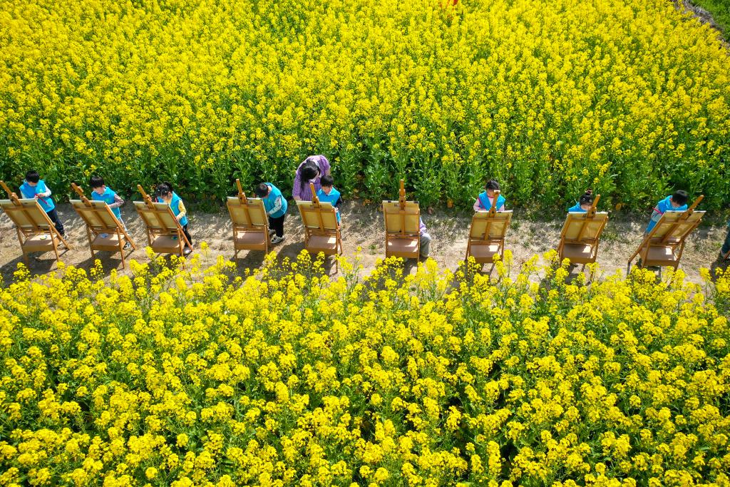 ↑2025年3月25日,江苏省如皋市下原镇,小朋友们在油菜花田间写生。(无人机照片)CICPHOTO/徐慧 摄
