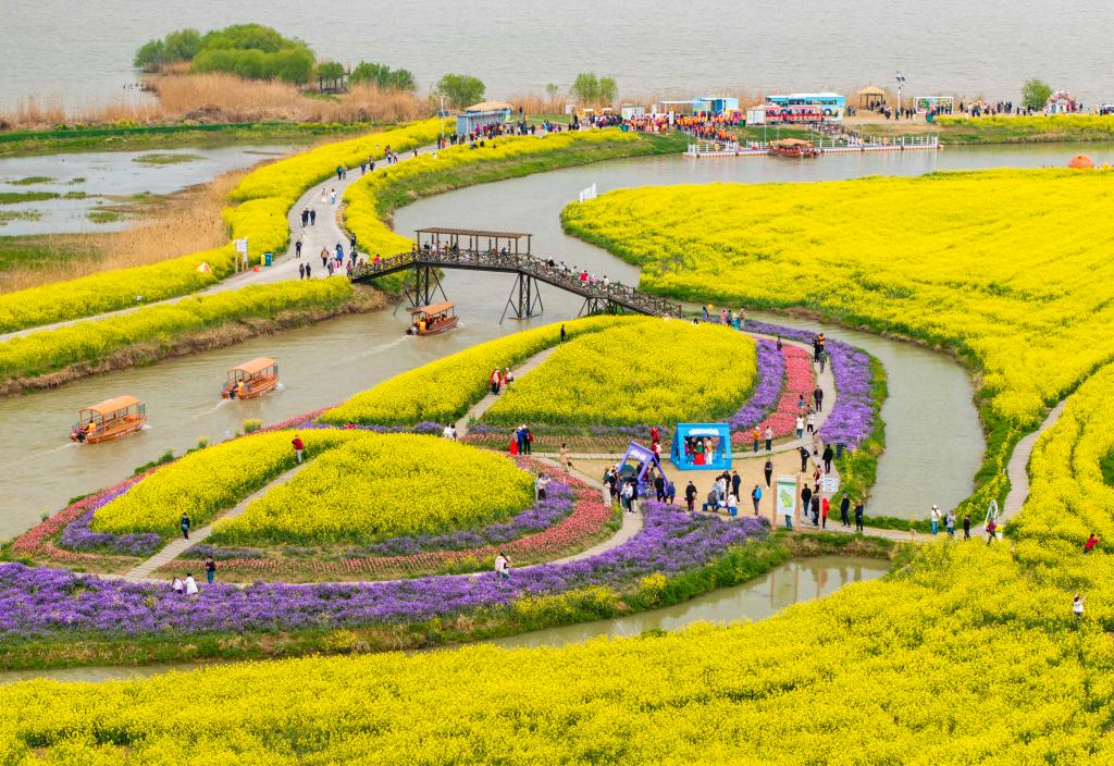 ↑2025年3月29日,游客在江苏省高邮市湖上花海景区赏花游玩。(无人机照片)CICPHOTO/周社根 摄