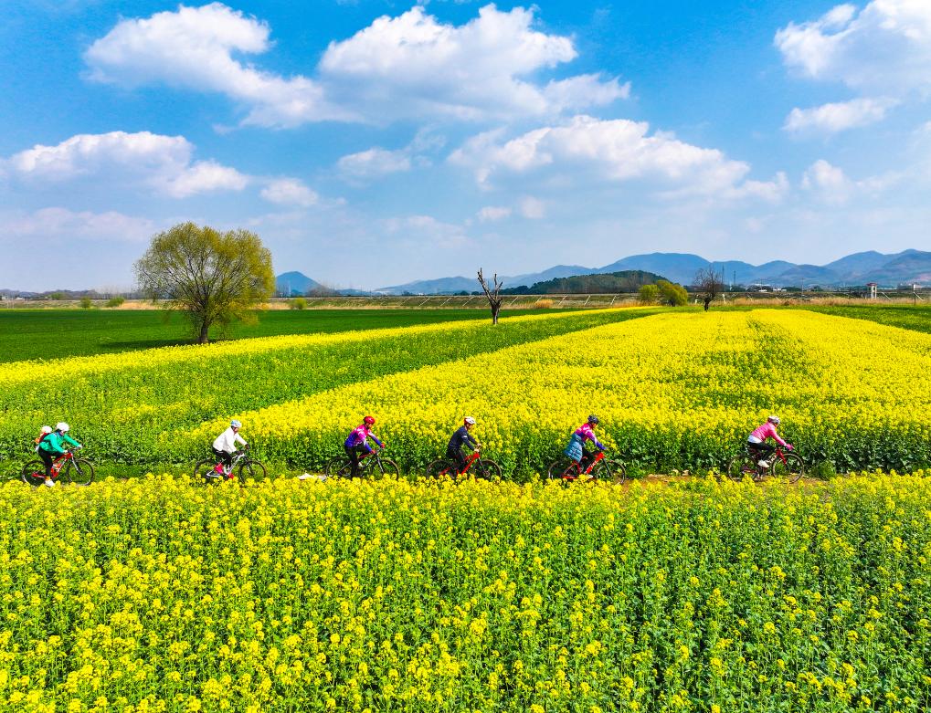 ↑2025年3月16日,安徽省芜湖市繁昌区荻港镇渡江村,自行车运动爱好者在油菜花田间骑行。(无人机照片)CICPHOTO/鲁君元 摄