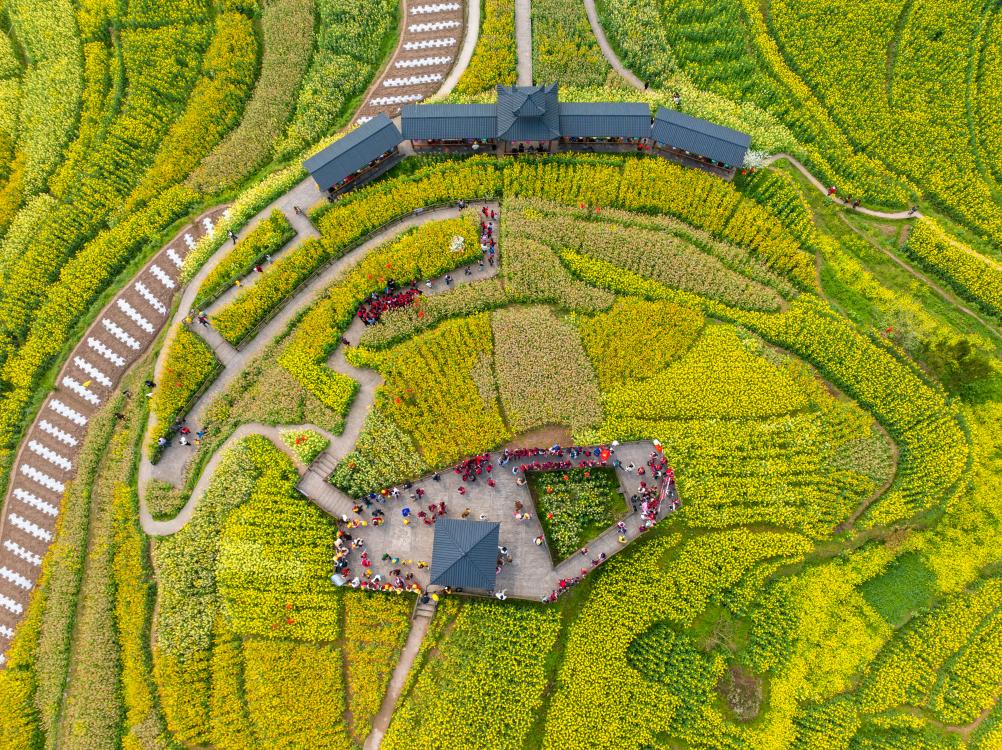 ↑2025年3月12日,重庆市南川区鸣玉镇中心社区,游客在油菜花田间赏花游玩。(无人机照片)罗川 摄 编辑:张雪萌