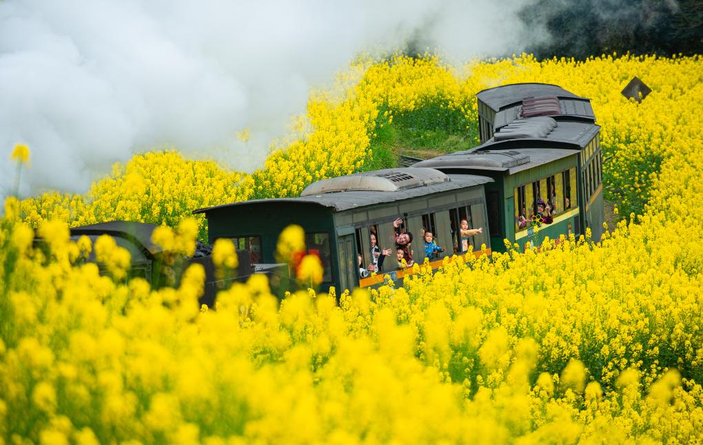↑2025年3月23日,四川省乐山市犍为县,游客乘坐嘉阳窄轨小火车赏花游玩。CICPHOTO/孔胜 摄