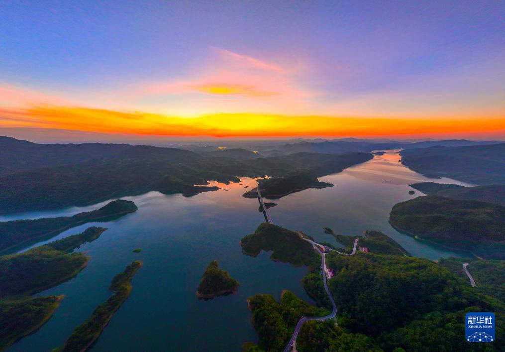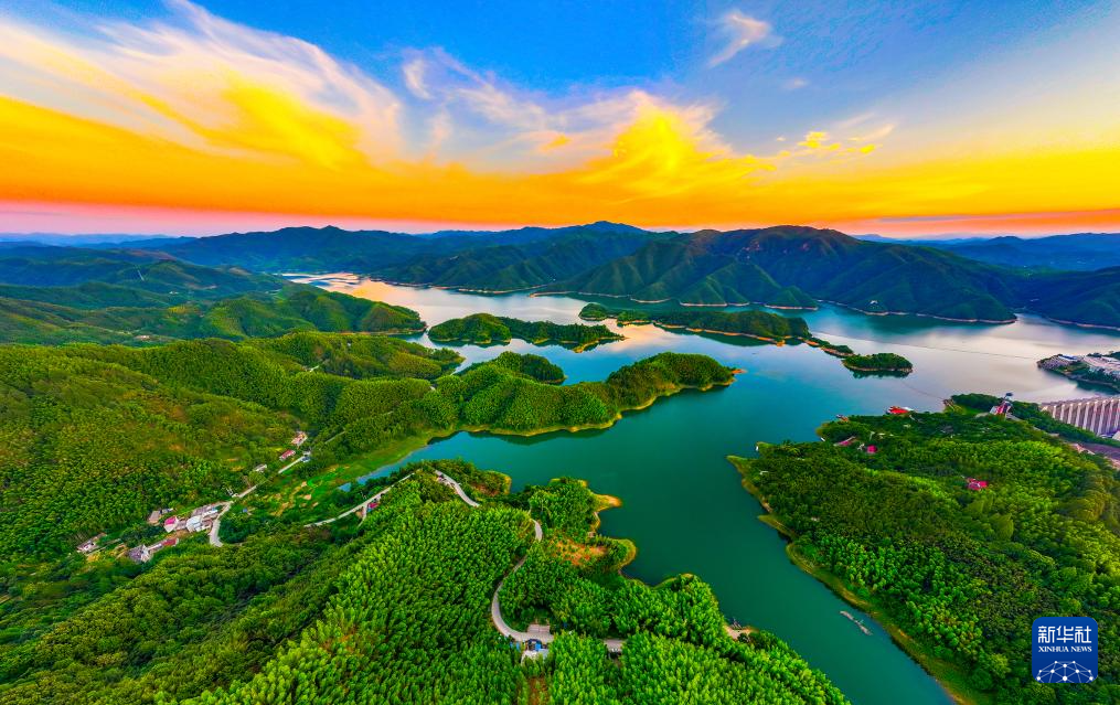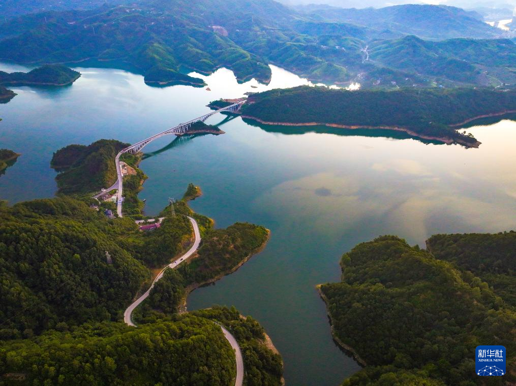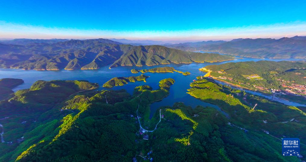 近日,安徽省六安市金寨县桃岭乡风和日丽。在阳光映照下,环绕的群山与荡漾的碧水相映成趣,构成了一幅诗意的山水画卷。