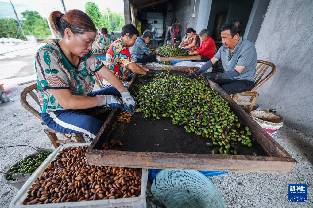 9月18日,在诸暨市赵家镇明乐果业专业合作社,当地农户在进行香榧青果剥壳。