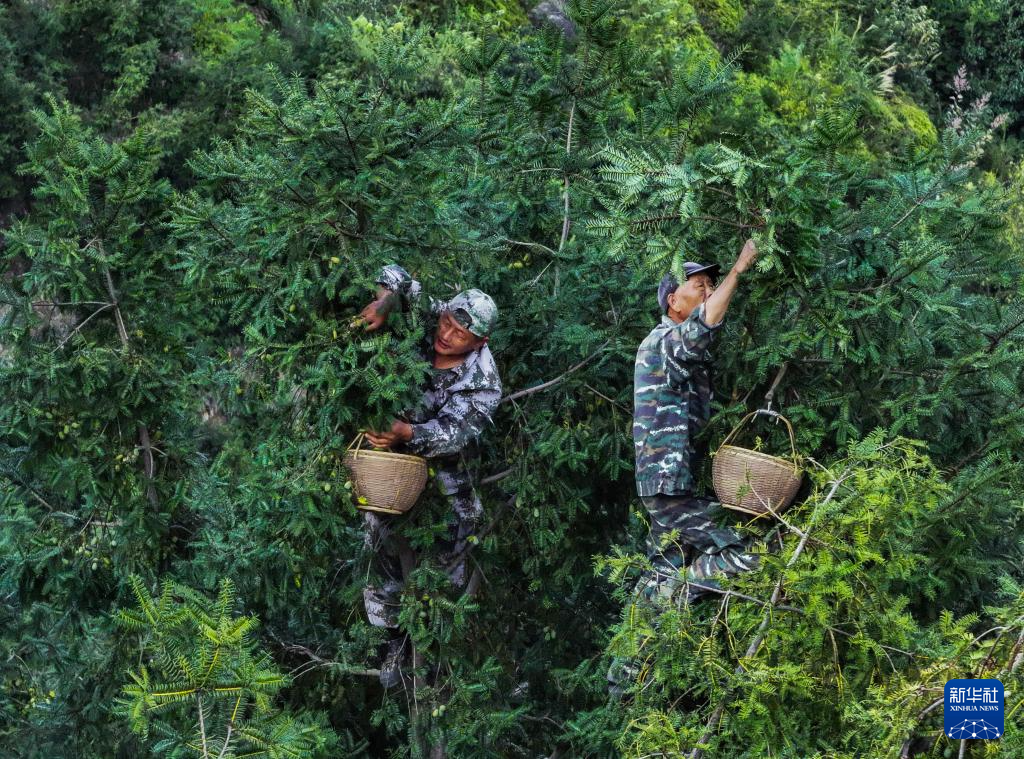 9月18日,诸暨市赵家镇宣家山村的香榧种植户在树上采摘香榧青果(无人机照片)。