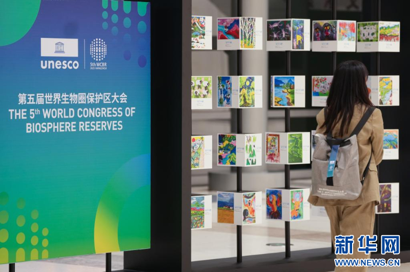 9月22日,代表在参观第五届世界生物圈保护区大会设置的儿童画国际巡展。