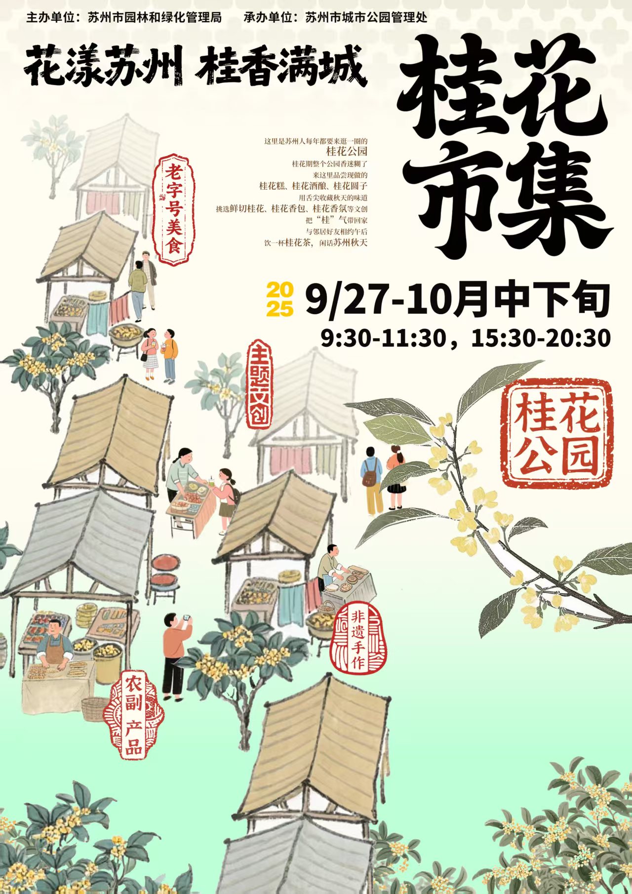 延续这份情感联结,本次桂花市集以“惠民、利民、助农”为宗旨,设置“寻味苏桂”美食区、“匠心造桂”文创区与“沁韵赏桂”文化体验区三大主题板块,汇聚老字号美食、本土农产品、非遗手作以及各类桂花主题文创产品。市集开放时间为每天9:30–11:30、15:30–20:30,游客不仅能品尝到现蒸桂花糕、桂花酒酿、桂花酥酪等传统风味,还能邂逅桂花拿铁、桂花乌龙奶茶等新式饮品,以舌尖留存秋日滋味;也可选购鲜切花枝、香囊、香氛等文创好物,将一缕“桂气”带回家中;或与好友小坐树下,沏一壶桂花茶,闲话苏州秋日。