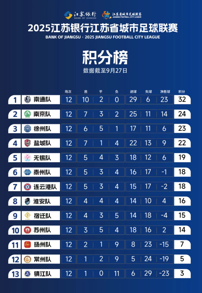 徐州队本轮被逼平,也让他们被南京队超越,最终排名第三。盐城队2:0击败扬州队后,排在第四位。另外一场比赛,苏州队主场与常州队奉献一场进球大战,最终苏州队3:2“绝杀”对手,排名第十,扬州、常州和镇江队分列11至13位。