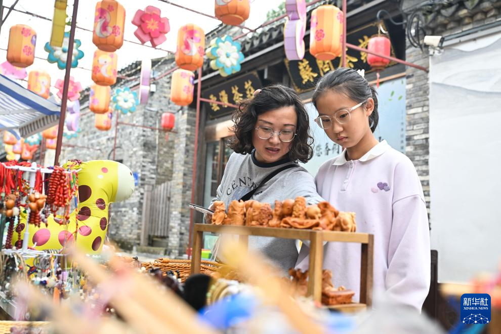 10月1日,游人在盱眙县第一山历史文化街区挑选手工艺品。