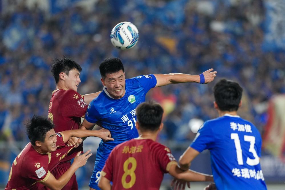 10月4日,南京队球员冯伯元(上右)在比赛中争抢头球。