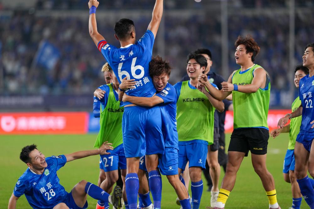 10月4日,南京队球员赛后拥抱庆祝胜利。