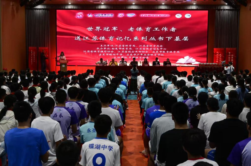 在启东市蝶湖中学和启东市少年业余体育学校,江苏省体育摄影协会向学校赠送了江苏体育记忆系列丛书,世界冠军张阔(蹦床)、沈铎(游泳)与600名学生进行了交流互动。他们用自己的成长经历鼓励学生们勇敢直面人生路上的挫折,为了梦想努力坚持。