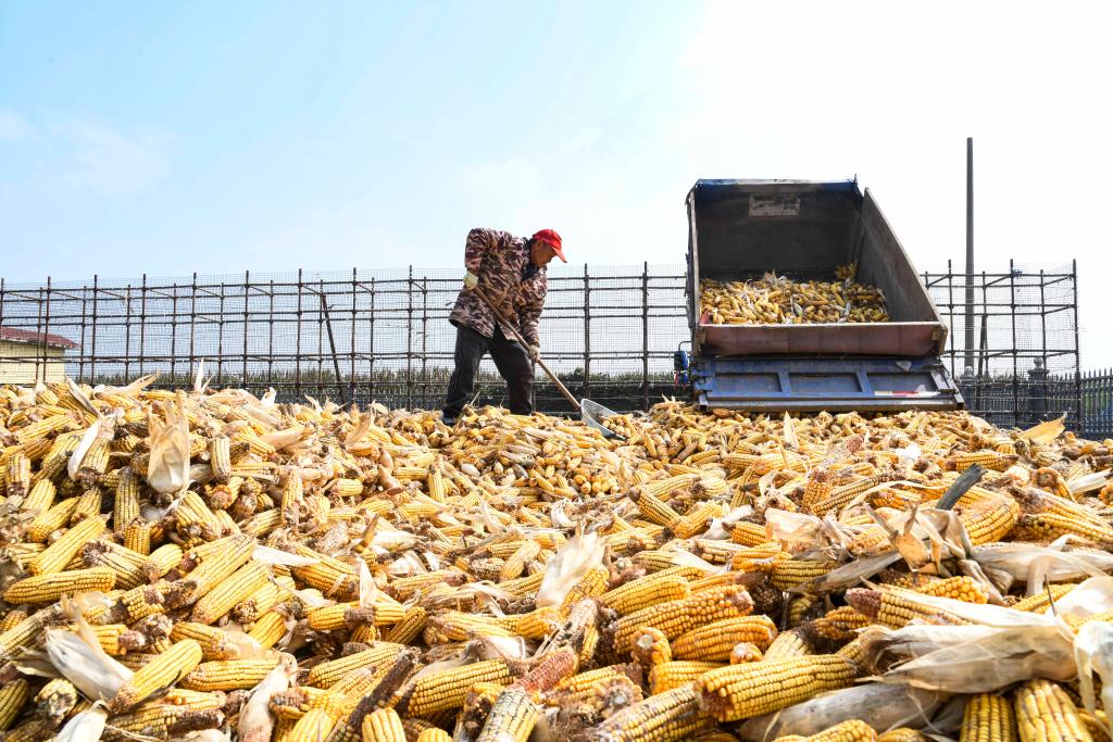 10月14日,河南省济源市五龙口镇农民晾晒刚收获的玉米。新华社发(苗秋闹摄)