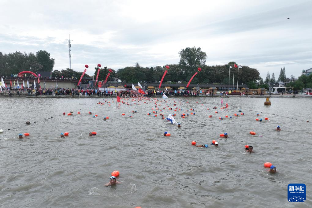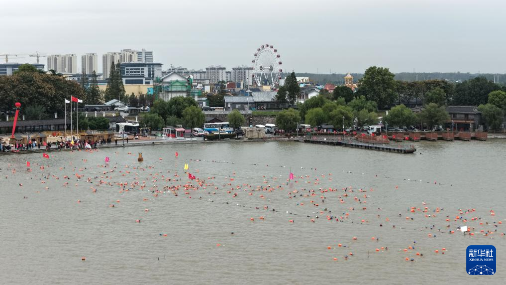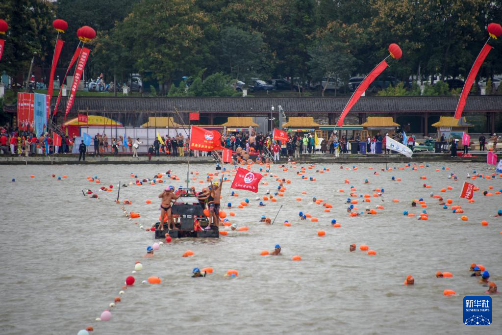 10月19日,选手在江苏省淮安市洪泽区渔人湾浴场参加游泳比赛。