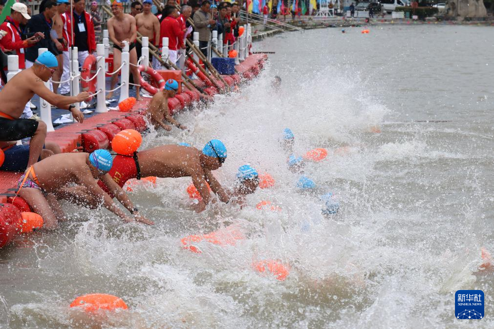 10月19日,在江苏省淮安市洪泽区渔人湾浴场,选手在比赛中入水。