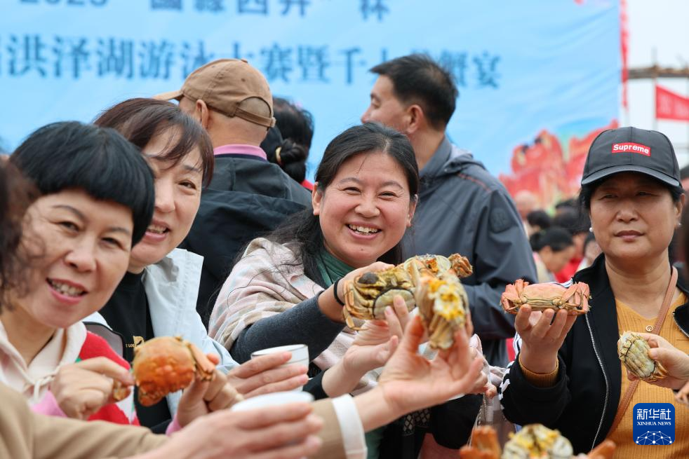 10月19日,人们在江苏省淮安市洪泽区渔人湾浴场参加品蟹宴。