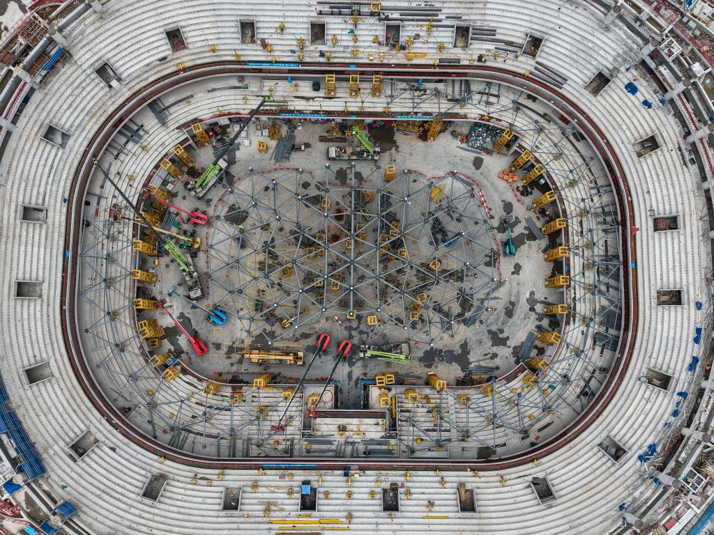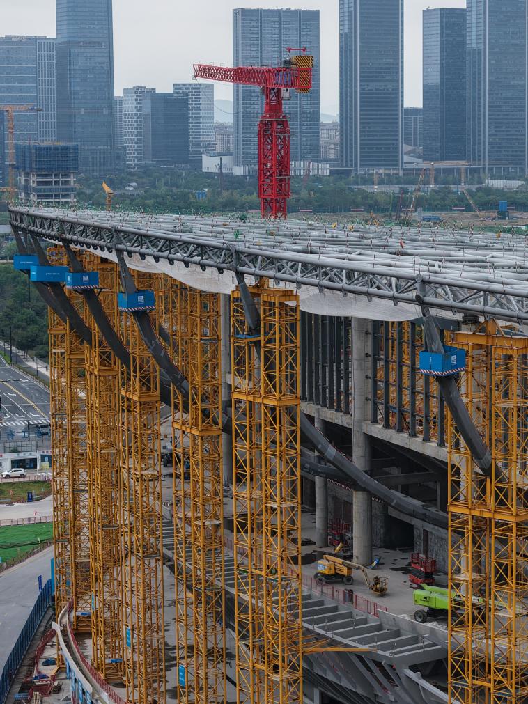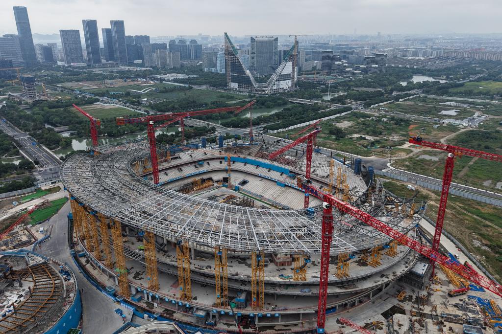 10月21日拍摄的余杭国际体育中心工程足球场项目(无人机照片)。据了解,足球场钢结构设计总重量达42000吨,其中屋盖钢结构占18000吨。
