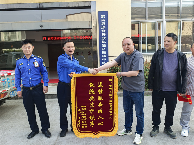 今年3月,安吉县综合行政执法局收到了一面锦旗,上面绣着“铁腕执法护秩序,温情服务暖人心”。去年年底,为了让达海建设集团赤芝工业园的项目顺利推进,安吉县综合行政执法局根据项目部的需求提前介入,通过实地走访、专题座谈,为施工方梳理安全生产、扬尘治理等规范要求,在出入口硬化、运输路线规划等易发风险环节提供精准指导。这面锦旗便是项目负责人对执法人员的精准指导和全程护航表达的由衷感谢。