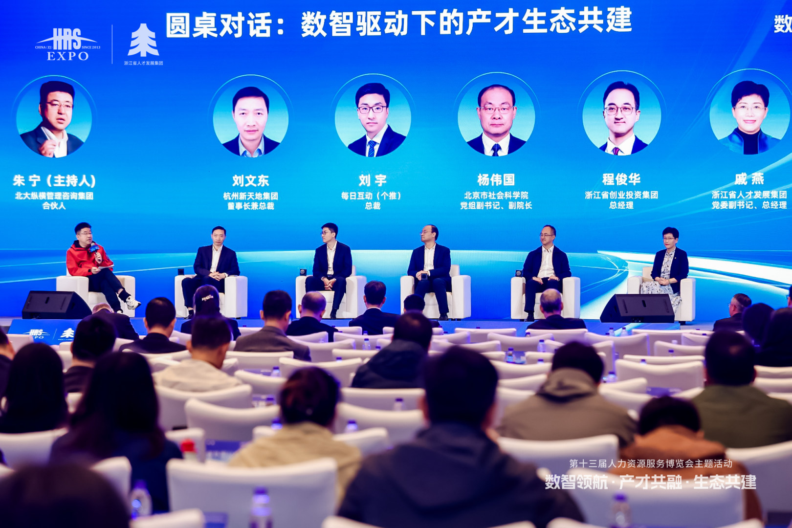 圆桌对话环节中,北京市社会科学院党组副书记、副院长杨伟国,省创投集团总经理程俊华,省人才集团党委副书记、总经理戚燕,每日互动(个推)总裁刘宇,杭州新天地集团董事长兼总裁刘文东及北大纵横管理咨询集团合伙人朱宁围绕“数智驱动下的产才生态共建”展开深入讨论,并达成核心共识:强化“四链”融合,共建开放、包容、协同的创新生态,积极应对数智化对产业与人才关系的重塑,加快形成以人才创新为核心驱动力的新发展格局。