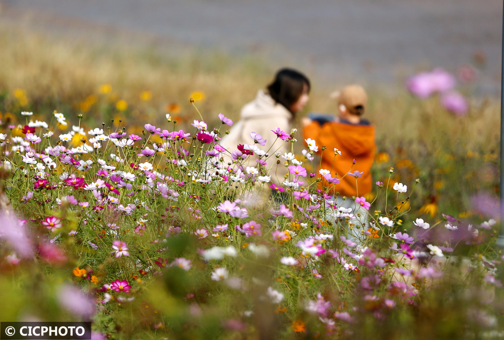 ↑2025年10月26日,人们在山西省临汾市襄汾县北汾河景观带赏花游玩。CICPHOTO/李现俊 摄