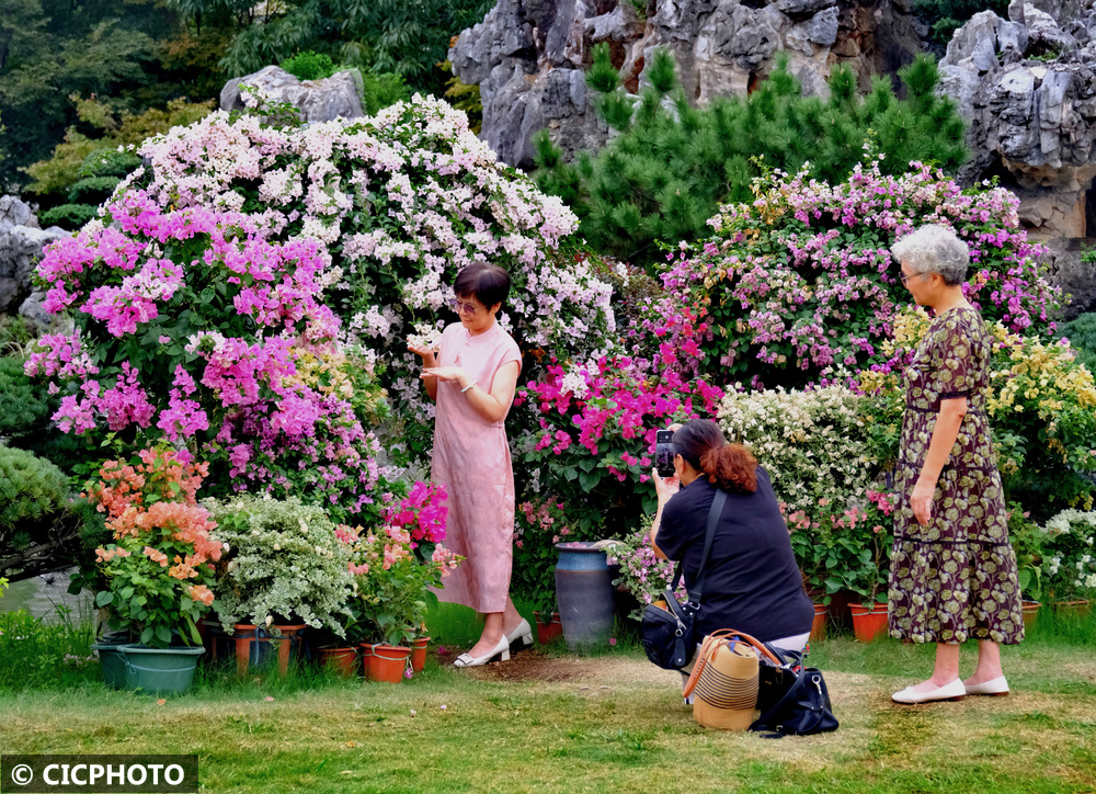 ↑2025年10月13日,人们在江苏省苏州市桐泾公园观赏三角梅。CICPHOTO/王建中 摄