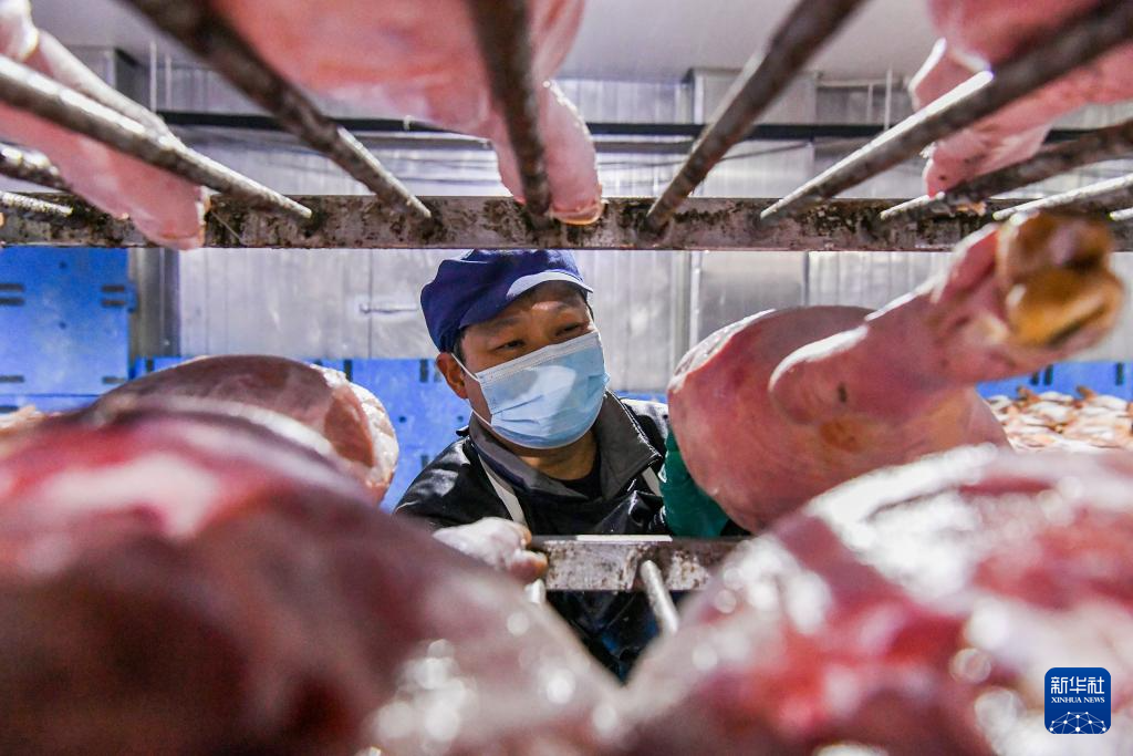 11月6日,在浙江省金华金年火腿有限公司车间内,技师在腌制火腿。