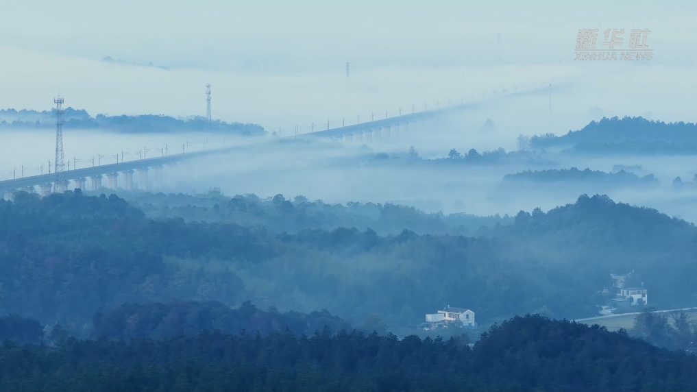 近日,安徽省池州市杏花村文化旅游区晨雾弥漫。从空中俯瞰,山峦、河流与铁路在云雾间若隐若现,宛若一幅流动的水墨画卷。