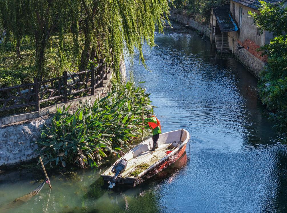 11月19日,吕山乡吕山村的保洁人员乘船进行河道日常保洁作业。