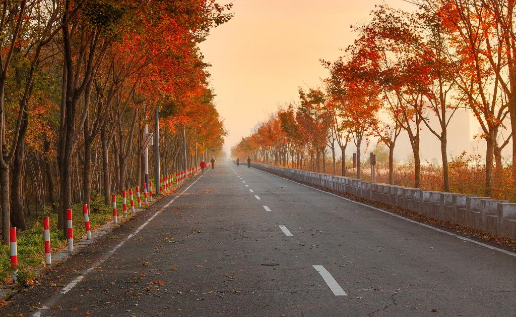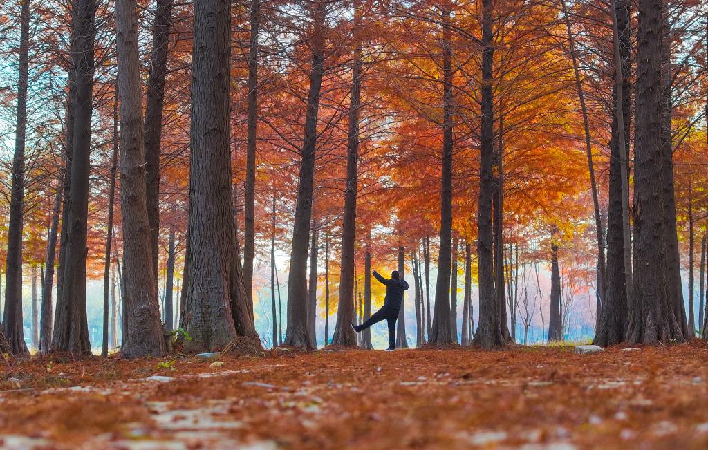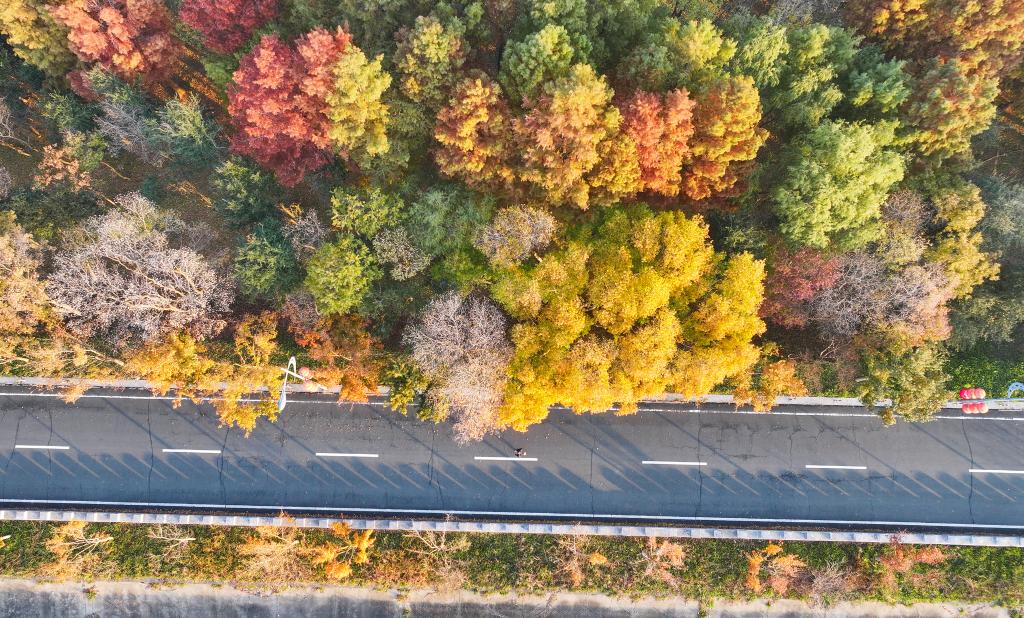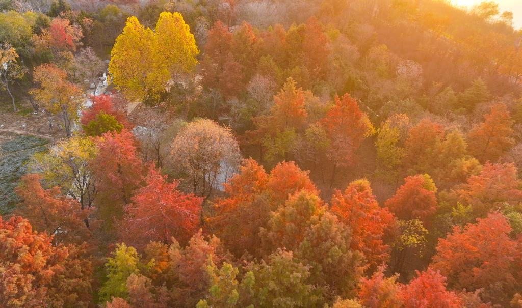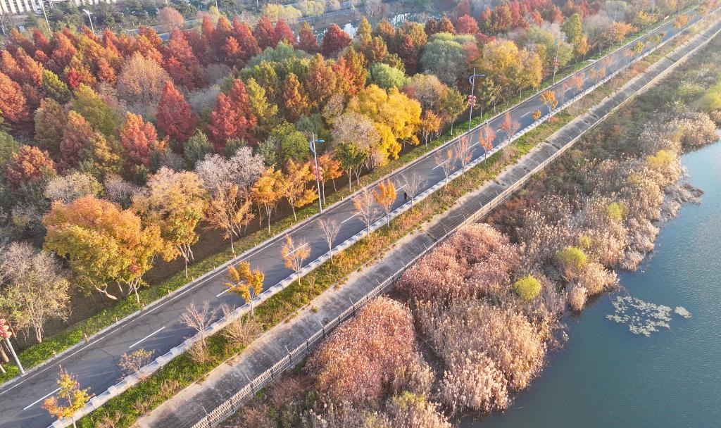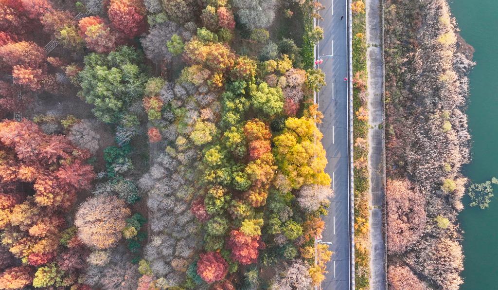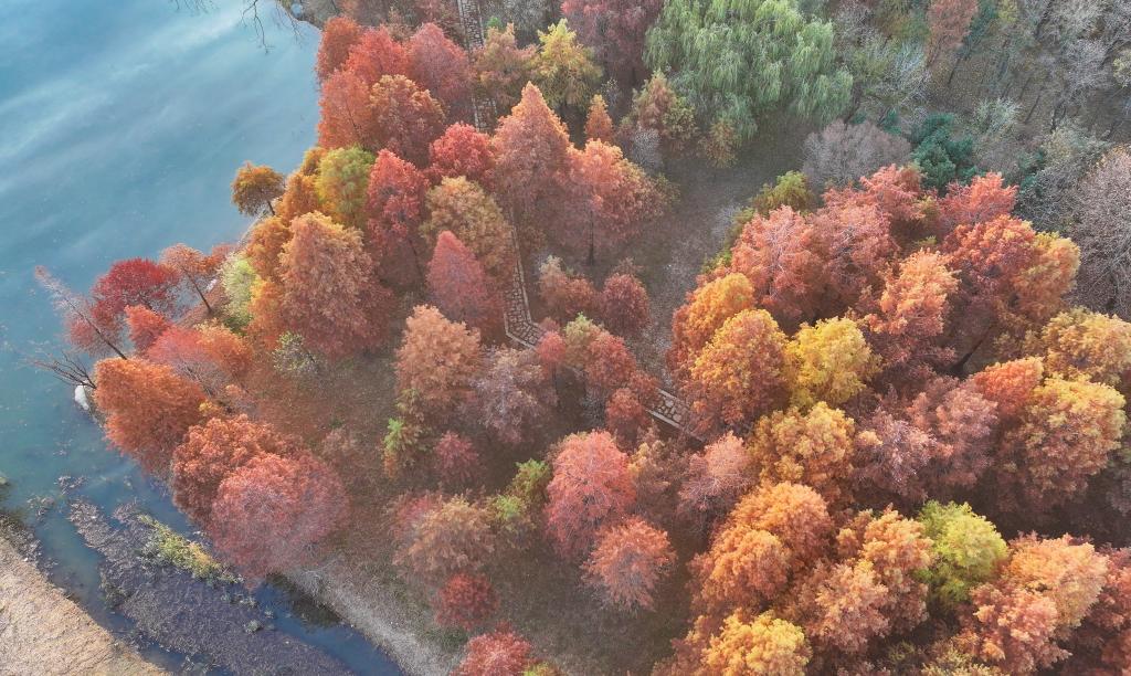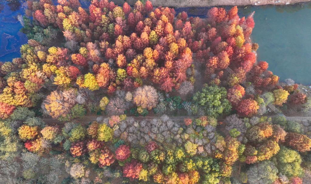 初冬时节,江苏省连云港市东海县西双湖国家湿地公园层林尽染,宛如诗意画卷。