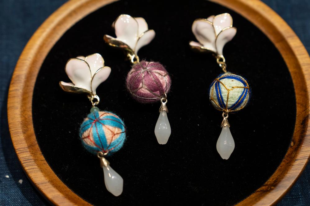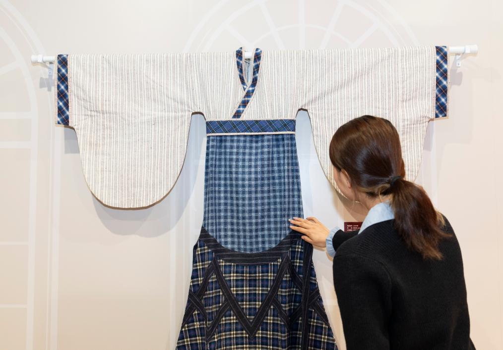 这是11月21日在北京故宫文创融合馆举行的“海派匠心·艺韵共融”上海市残疾人文化艺术作品展上拍摄的“土布汉服”作品。