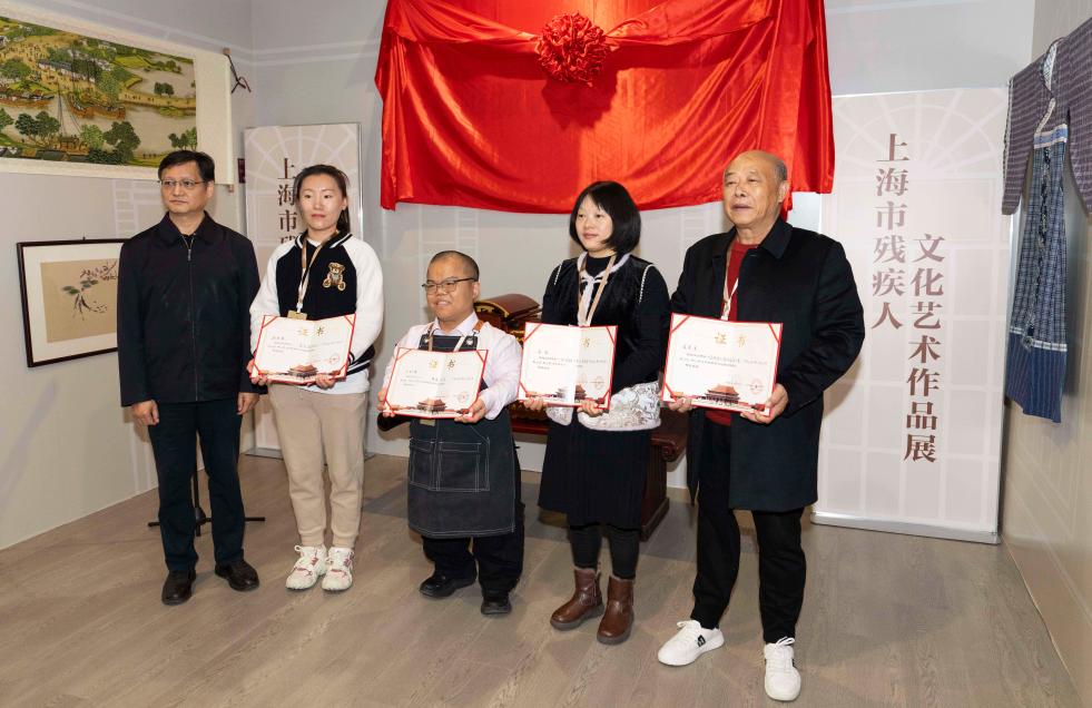 11月21日,在北京故宫文创融合馆举行的“海派匠心·艺韵共融”上海市残疾人文化艺术作品展上,残疾人艺术家代表合影留念。 11月21日,由上海市残疾人联合会主办的“海派匠心·艺韵共融”上海市残疾人文化艺术作品展在北京故宫文创融合馆拉开帷幕。本次展览参展作品出自上海残疾人之手,他们在非遗传承人的指导下,将对生活的热爱与对文化的敬畏注入作品之中。