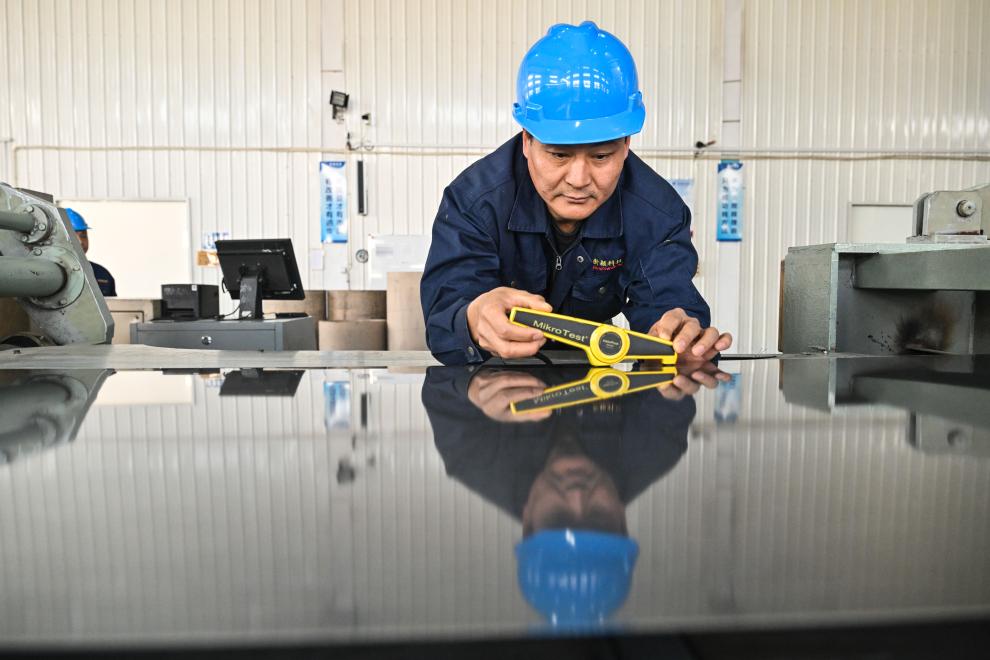 11月25日,在苏州新颖新材料科技股份有限公司冰箱面板自动化生产线,工人测量产品漆膜厚度。