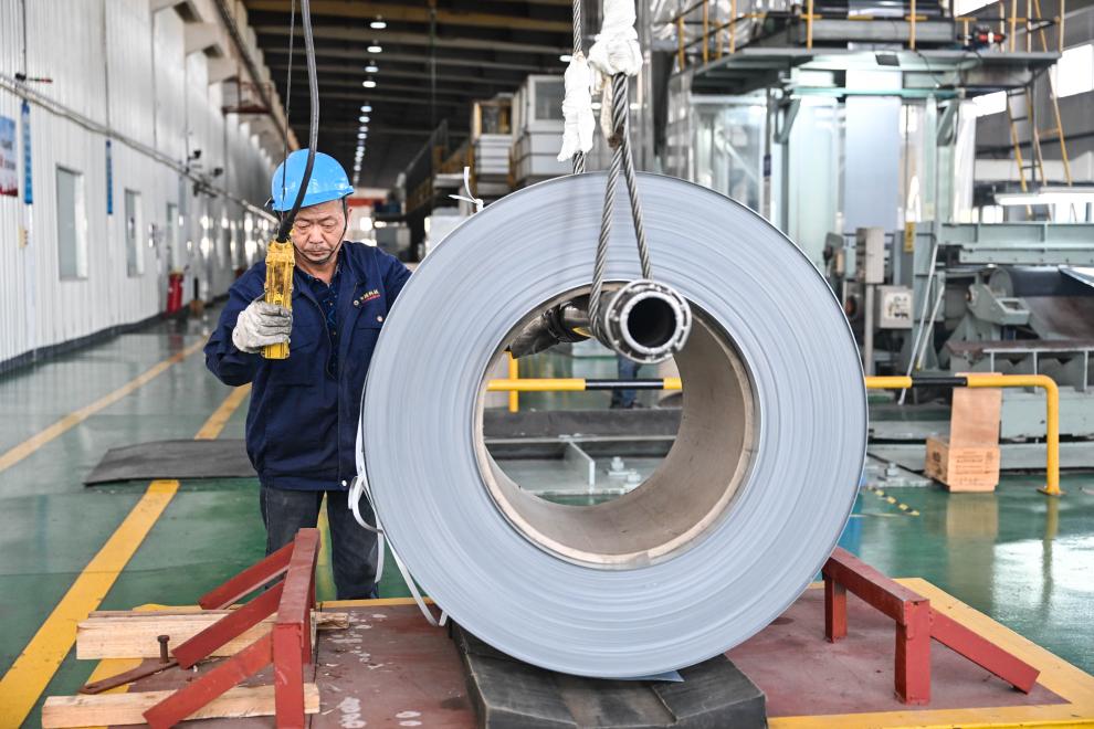 11月25日,在苏州新颖新材料科技股份有限公司,工人吊运冰箱面板半成品。