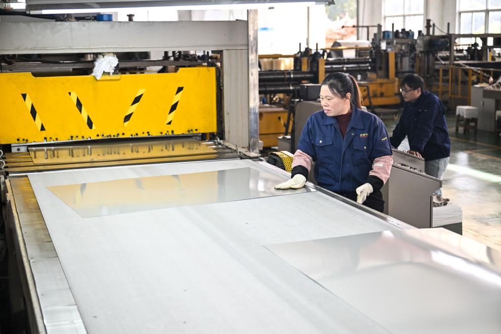 11月25日,在苏州新颖新材料科技股份有限公司,工人对冰箱面板成品进行质检。