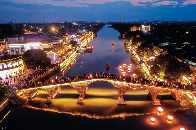 游客在浙江省杭州市塘栖古镇的广济桥观赏运河夜景(2025 年 10 月 2 日摄)    徐昱摄 / 本刊
