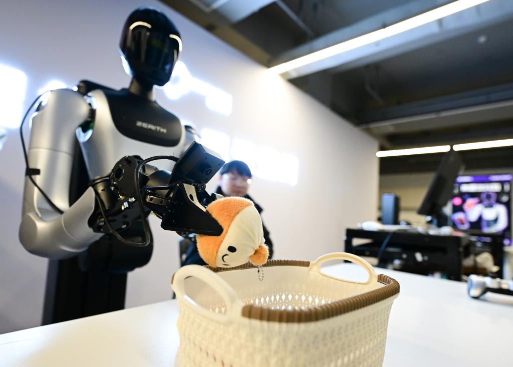在合肥零次方机器人有限公司,一台台人形机器人正在处理“家务活”。据介绍,这里的机器人配置了三颗摄像头,头部的一颗用来观察整个环境,手部两颗摄像头用来观察局部细节,保证精确判断和操作。通过专业化的训练与场景定制,机器人可以完成整理桌面、清扫洗手间等工作。